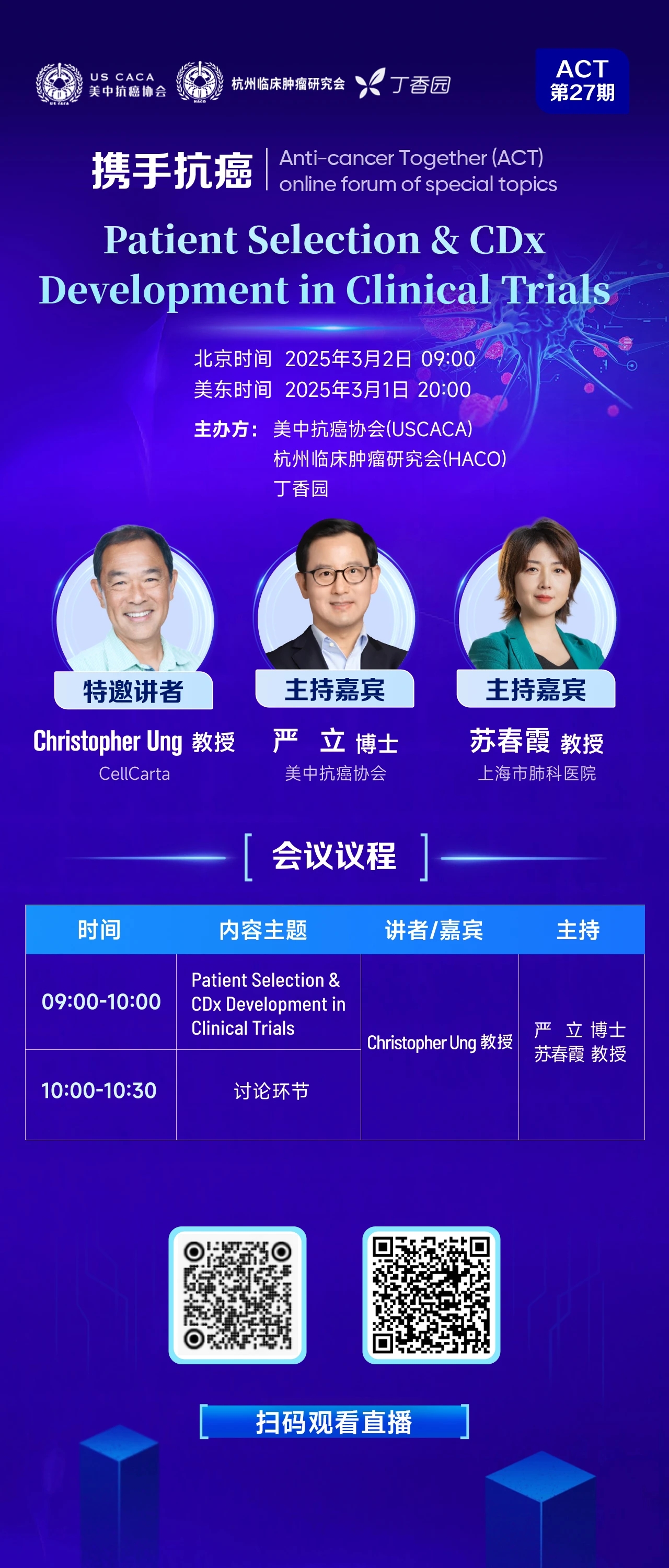 北京时间 2025 年 3 月 2 日上午 9:00,由美中抗癌协会、杭州临床肿瘤研究会(HACO)、丁香园联合主办的「携手抗癌」第二十七期活动将如约举行,活动将由 CellCarta 首席科学商务官 Christopher Ung 分享他在生物标志物开发与个性化医疗领域的卓越见解,精彩内容,敬请关注!