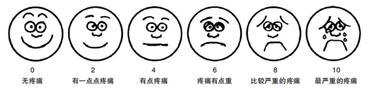 此外,脸谱评估法也是常用的疼痛评估方法。医务人员和患者家属可通过观察患者疼痛时的表情,评估疼痛程度。